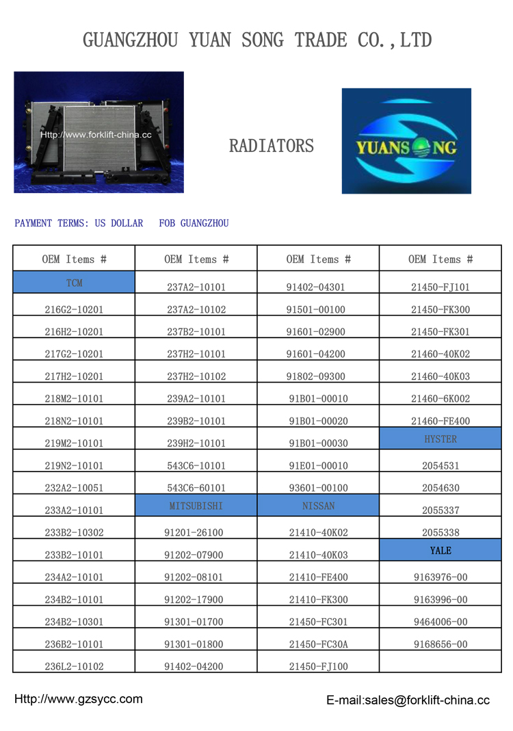 Gzsycc.com supply high quality Forklift Radiator.With reasonable price,this part can  make your Forklift Radiator as good as new one.We provide any forklift parts according to your needs.